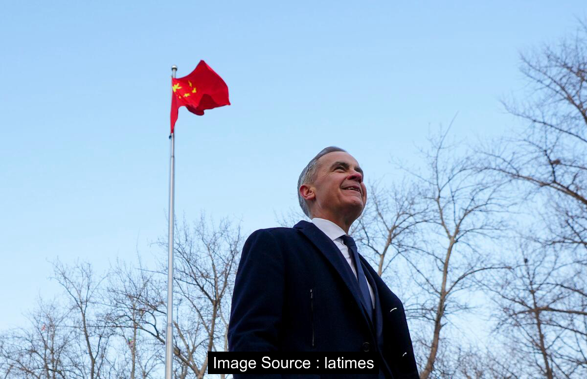 캐나다 총리 마크 카니는 금요일 베이징에서 열린 기자회견을 마치고 중국 국기 앞을 지나가고 있다. 이는 캐나다가 중국 전기차에 대한 관세를 대폭 인하하는 무역 거래를 체결하면서 트럼프 정책보다 중국을 더 큰 경제적 위협으로 간주하는 극적인 변화를 보여주고 있다.